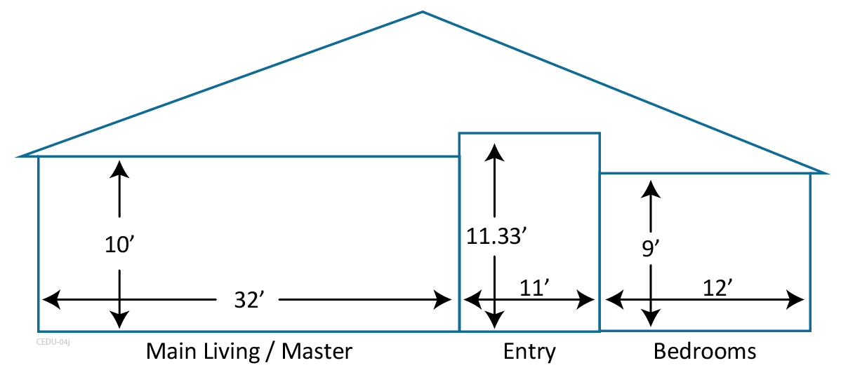 As shown in the simple house section view below, a house has three rectangular rooms with different flat ceiling heights, including:- A main living and master bedroom section that is 45.0’ long by 32.0’ wide with a 10.0’ ceiling height