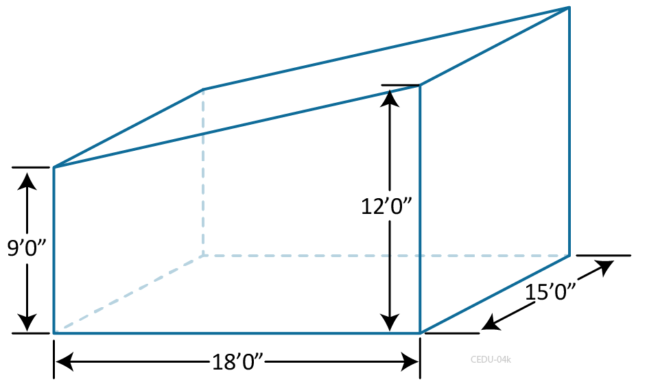 Hint 1: The room’s average ceiling height can be calculated by adding the left side wall height (9.0’) and right side wall height (12.0’) and dividing by 2.